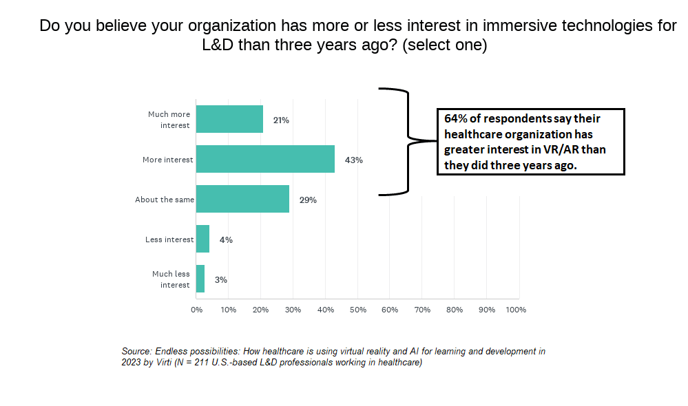 A copy of the survey report is also freely available for download here: “Endless possibilities: How healthcare is using virtual reality and AI for learning and development in 2023.”